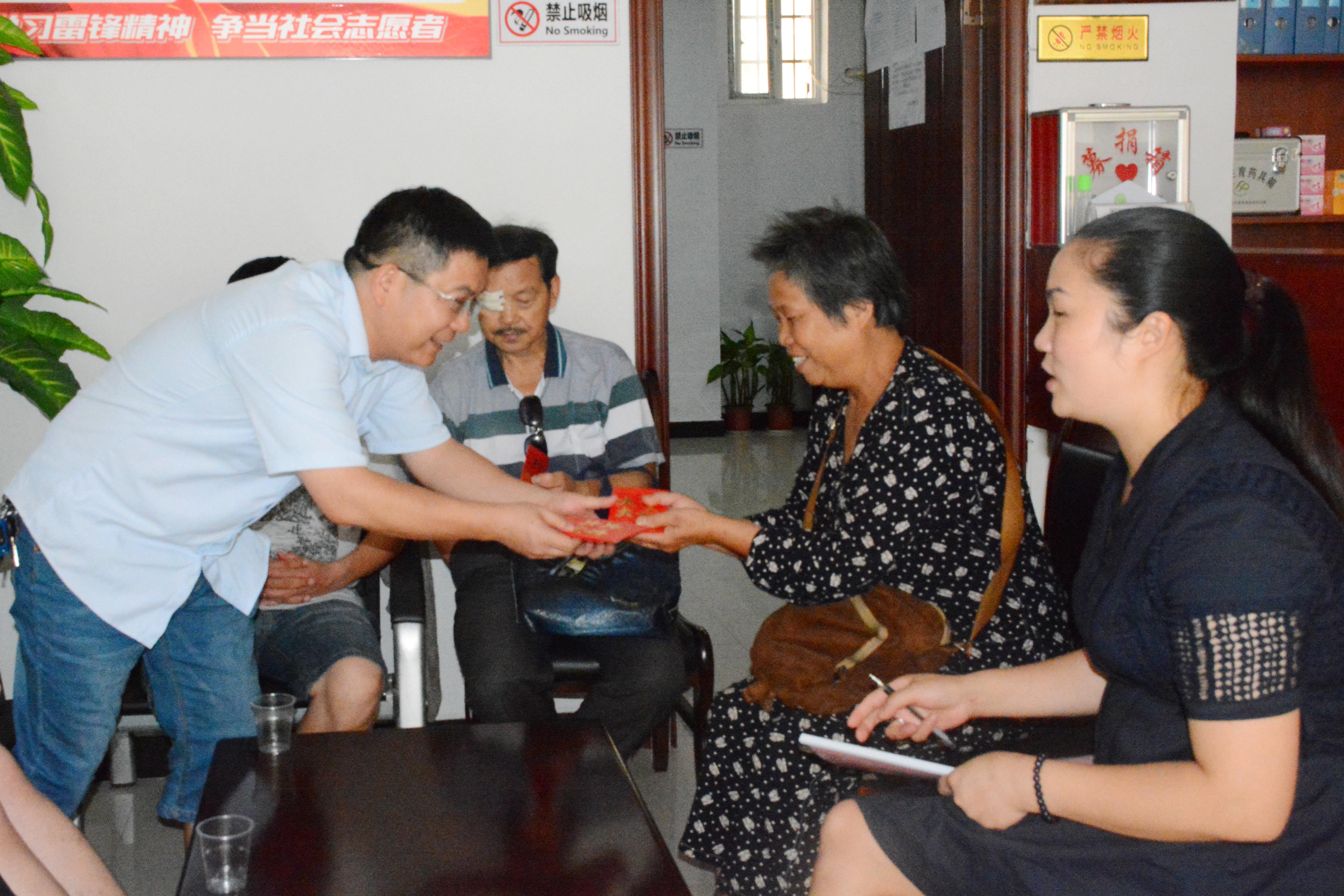 为贯彻落实“两学一做”学习教育,推行党员教育管理制度常态化,以实际行动为生活困难群众办实事、办好事,7月29日,我院机关第五党支部书记张雪松、副书记杨飞等一行6人,在滨江社区蒲书记陪同下走访慰问低保户,为社区困难户送上关爱和温暖。